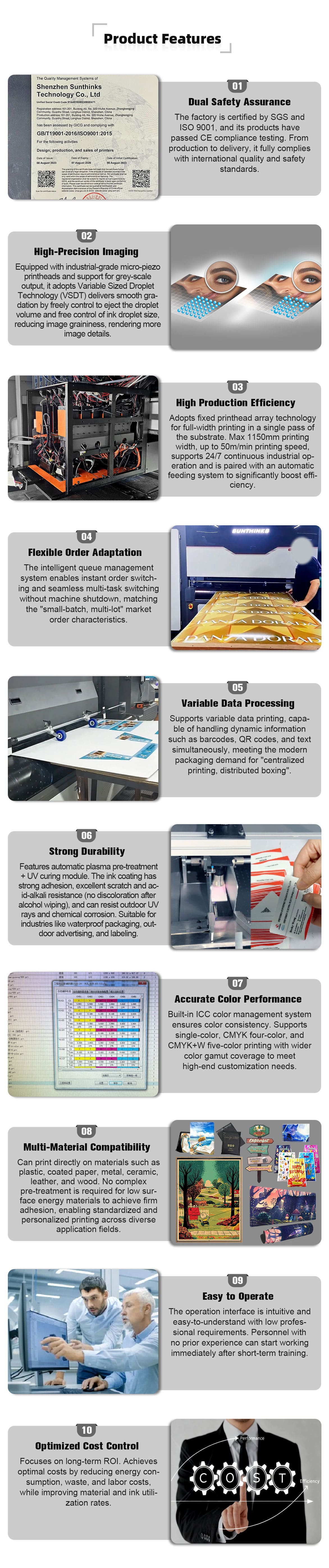The Sunthinks SU1150 single pass uv printer is an ideal large sized, high speed, single pass uv printing machine, supporting monochrome, 4-color CMYK, or 5-color CMYK+W printing. It's suitable for batch printing and personalized customization across a wide range of industries, including high-end gift packaging, plastic packaging, plastic corrugated paper, coated paper, indoor/outdoor billboards, wood panels, file folders, notebook covers, metal packaging, leather, and various corporate/event promotional gifts.